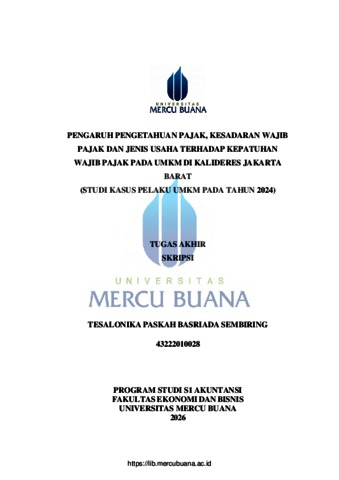SEMBIRING, TESALONIKA PASKAH BASRIADA (2026) PENGARUH PENGETAHUAN PAJAK, KESADARAN WAJIB PAJAK DAN JENIS USAHA TERHADAP KEPATUHAN WAJIB PAJAK PADA UMKM DI KALIDERES JAKARTA BARAT (STUDI KASUS PELAKU UMKM PADA TAHUN 2024). S1 thesis, Universitas Mercu Buana Jakarta.