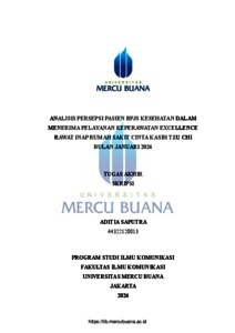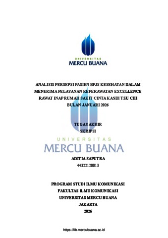 SAPUTRA, ADITIA (2026) ANALISIS PERSEPSI PASIEN BPJS KESEHATAN DALAM MENERIMA PELAYANAN KEPERAWATAN EXCELLENCE RAWAT INAP RUMAH SAKIT CINTA KASIH TZU CHI BULAN JANUARI 2026. S1 thesis, Universitas Mercu Buana Jakarta.