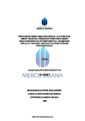 RENANINGTYAS, ANASTASIA PUJI (2026) PENGARUH GREEN ORGANIZATIONAL CULTURE DAN GREEN TRAINING TERHADAP EMPLOYEE GREEN BEHAVIOR DENGAN ENVIRONMENTAL AWARENESS SEBAGAI VARIABEL MEDIASI DI KEMENTERIAN PERINDUSTRIAN. S2 thesis, Universitas Mercu Buana Jakarta.