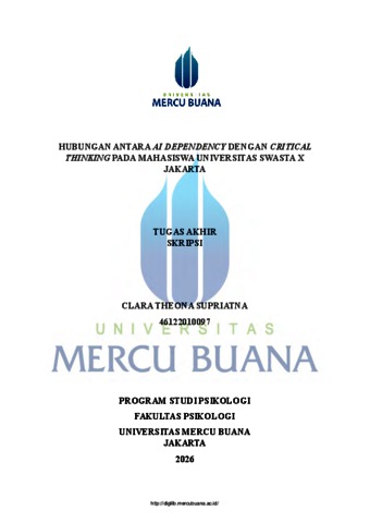SUPRIATNA, CLARA THEONA (2026) HUBUNGAN ANTARA AI DEPENDENCY DENGAN CRITICAL THINKING PADA MAHASISWA UNIVERSITAS SWASTA X JAKARTA. S1 thesis, UNIVERISTAS MERCU BUANA - BUNCIT.