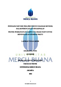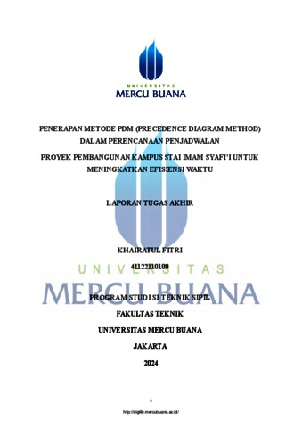 FITRI, KHAIRATUL (2024) PENERAPAN METODE PDM (PRECEDENCE DIAGRAM METHOD) DALAM PERENCANAAN PENJADWALAN PROYEK PEMBANGUNAN KAMPUS STAI IMAM SYAFI’I UNTUK MENINGKATKAN EFISIENSI WAKTU. S1 thesis, UNIVERISTAS MERCU BUANA - BUNCIT.