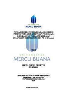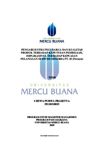 PRASETYA, I DEWA PURWA (2020) PENGARUH STRATEGI HARGA DAN KUALITAS PRODUK TERHADAP KEPUTUSAN PEMBELIAN, IMPLIKASINYA TERHADAP KEPUASAN PELANGGAN DI DIVISI MINERBA PT. SI (Persero). S2 thesis, UNIVERSITAS MERCU BUANA - CIBUBUR.