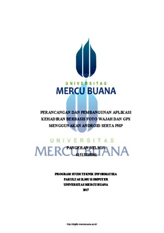NELSON, PANGERAN (2017) PERANCANGAN DAN PEMBANGUNAN APLIKASI KEHADIRAN BERBASIS FOTO WAJAH DAN GPS MENGGUNAKAN ANDROID SERTA PHP. S1 thesis, UNIVERSITAS MERCU BUANA - CIBUBUR.