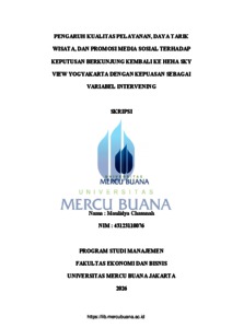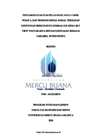 CHASANAH, MAULIDYA (2026) PENGARUH KUALITAS PELAYANAN, DAYA TARIK WISATA, DAN PROMOSI MEDIA SOSIAL TERHADAP KEPUTUSAN BERKUNJUNG KEMBALI KE HEHA SKY VIEW YOGYAKARTA DENGAN KEPUASAN SEBAGAI VARIABEL INTERVENING. S1 thesis, Universitas Mercu Buana Jakarta.