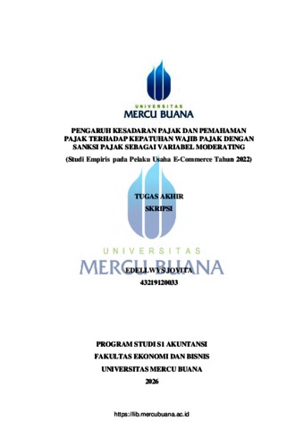 JOVITA, EDELLWYS (2026) PENGARUH KESADARAN PAJAK DAN PEMAHAMAN PAJAK TERHADAP KEPATUHAN WAJIB PAJAK DENGAN SANKSI PAJAK SEBAGAI VARIABEL MODERATING (Studi Empiris pada Pelaku Usaha E-Commerce Tahun 2022). S1 thesis, Universitas Mercu Buana Jakarta.