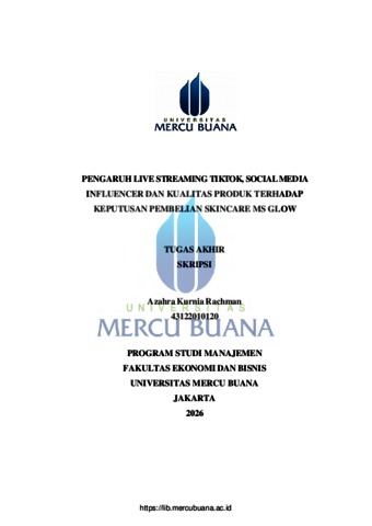 Rachman, Azahra Kurnia (2026) PENGARUH LIVE STREAMING TIKTOK, SOCIAL MEDIA INFLUENCER DAN KUALITAS PRODUK TERHADAP KEPUTUSAN PEMBELIAN SKINCARE MS GLOW. S1 thesis, Universitas Mercu Buana Jakarta.