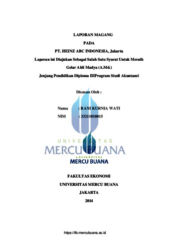 Wati, Rani Kurnia (2014) LAPORAN MAGANG PADA PT. HEINZ ABC INDONESIA, Jakarta. D3 thesis, Universitas Mercu Buana.
