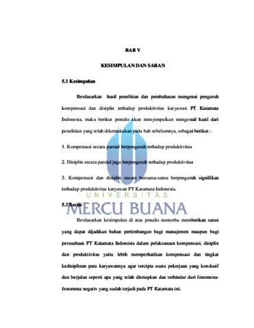 Lestari, Ayu (2014) PENGARUH KOMPENSASI DAN DISIPLIN TERHADAP PRODUKTIVITAS KARYAWAN PT KATAMATA. S1 thesis, Universitas Mercu Buana.