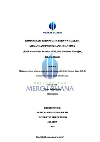 DEVIA, WINDA RAHMI (2014) KOMUNIKASI TERAPEUTIK PERAWAT DALAM MENANGANI PASIEN GANGGUAN JIWA (Studi Kasus Pada Perawat di RSJ Dr. Soeharto Heerdjan, Jakarta Barat). S1 thesis, Universitas Mercu Buana.