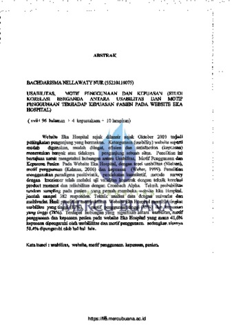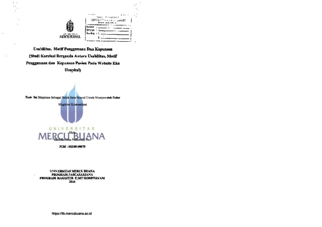 Nur, Bachdarisma Nellawaty (2014) HUBUNGAN USABILITAS, MOTIF PENGGUNAAN DAN KEPUASAN (Studi Korelasi Berganda Antara Usabilitas, Motif Penggunaan Dan Kepuasan Pasien Pada Website Eka Hospital). S2 thesis, Universitas Mercu Buana.