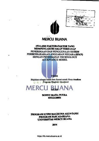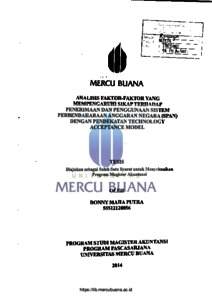 PUTRA, DONNY MAHA (2014) Analisis Faktor-Faktor Yang Mempengaruhi Sikap Terhadap Penerimaan dan Penggunaan Sistem Perbendaharaan Anggaran Negara (SPAN) Dengan Pendekatan Technology Acceptance Model. S2 thesis, Universitas Mercu Buana.