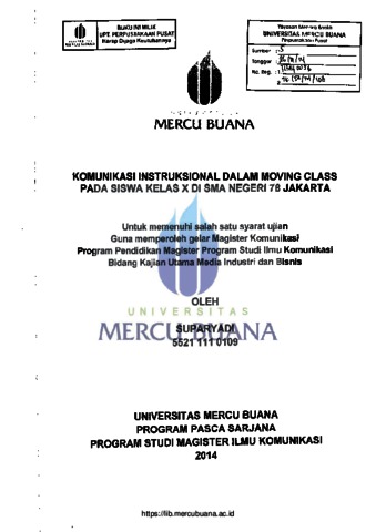 SUPARYADI, SUPARYADI (2014) KOMUNIKASI INSTRUKSIONAL DALAM MOVING CLASS PADA SISWA KELAS X DI SMA NEGERI 78 JAKARTA. S2 thesis, Universitas Mercu Buana Jakarta.