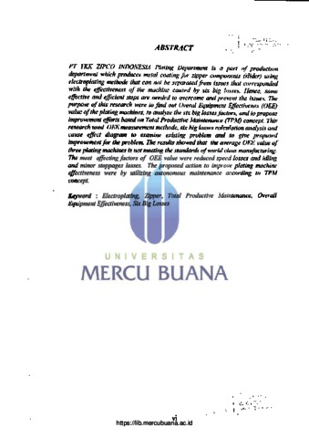 | Uncontrolled Keywords: | Electroplating, Zipper, Total Productive Maintenance, Overall Equipment Effectiveness, Six Big Losse |