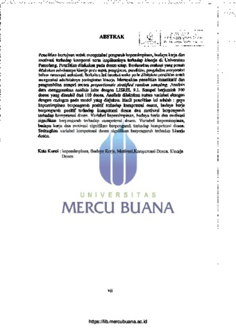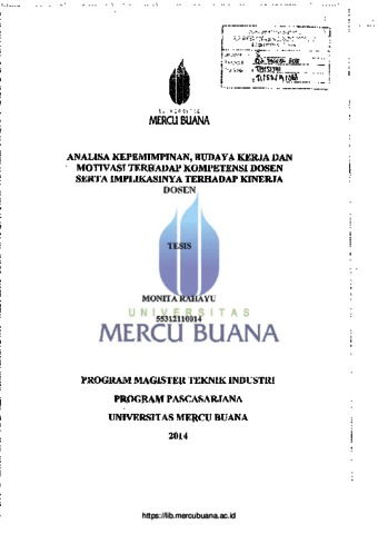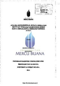 RAHAYU, MONITA (2014) ANALISA KEPEMIMPINAN, BUDAYA KERJA DAN MOTIVASI TERHADAP KOMPETENSI DOSEN SERTA IMPLIKASINYA TERHADAP KINERJA DOSEN. S2 thesis, Universitas Mercu Buana Jakarta.