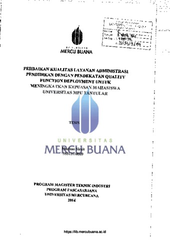 SIRAIT, MORHAN (2014) PERBAIKAN KUALITAS LAYANAN ADMINISTRASI PENDIDIKAN DENGAN PENDEKATAN QUALITY FUNCTION DEPLOYMENT UNTUK MENINGKATKAN KEPUASAN MAHASISWA UNIVERSITAS MPU TANTULAR. S2 thesis, Universitas Mercu Buana Jakarta.