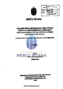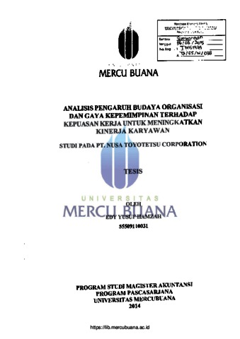 HAMZAH, EDY YUSUF (2014) ANALISIS PENGARUH BUDAYA ORGANISASI DAN GAYA KEPEMIMPINAN TERHADAP KEPUASAN KERJA UNTUK MENINGKATKAN KINERJA KARYAWAN. S2 thesis, Universitas Mercu Buana Jakarta.