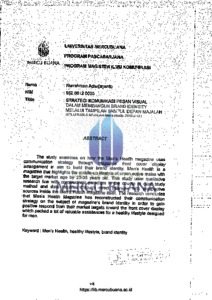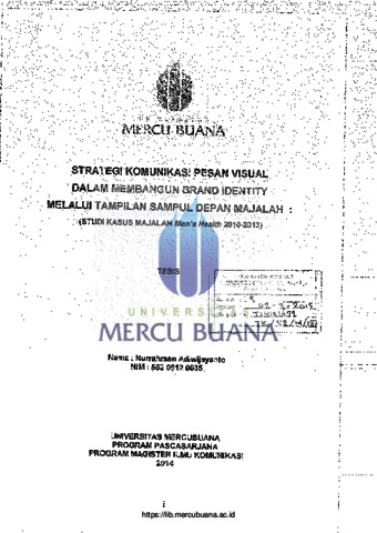 ADIWIJAYANTO, NURRAHMAN (2014) STRATEGI KOMUNIKASI PESAN VISUAL DALAM MEMBANGUN BRAND IDENTITY MELALUI TAMPILAN SAMPUL DEPAN MAJALAH (Studi Kasus Majalah Mens Health 2010-2013). S2 thesis, Universitas Mercu Buana Jakarta.