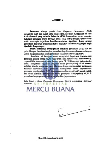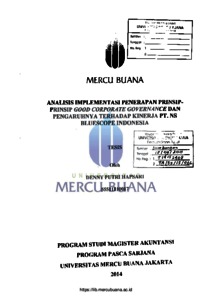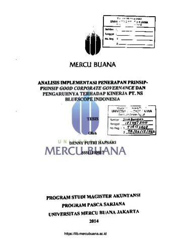 HAPSARI, DENNY PUTRI (2014) ANALISIS IMPLEMENTASI PENERAPAN PRINSIP-PRINSIP GOOD CORPORATE GOVERNANCE DAN PENGARUHNYA TERHADAP KINERJA PERUSAHAAN PT. NS BLUESCOPE INDONESIA. S2 thesis, Universitas Mercu Buana Jakarta.