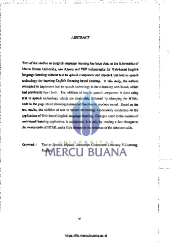 Two of the studies on English language learning has been done at the Informatics of Mercu Buana University, use JQuery and PHP technologies for Web-based English language learning without text to speech component and research use text to speech technology for learning English listening-based Desktop. In this study, the authors attempted to implement text to speech technology in the e-learning web-based, which had previously been built. The addition of text to speech component is done using text to speech technology which are client-side, followed by changing the HTML code in the page about allowing summoned function to produce sound. Based on the test results, the addition of text to speech technology successfully conducted on the application of Web-based English language learning. Changes made to the success of web-based learning application is minimized, it is only by making a few changes to the source code of HTML and a little change in the structure of the database table. Keyword: Text to Speech, eech, eSpeak, eSpeak, Javascript Javascript Component Component Listen Listening E-Learning, MERCU BUANA