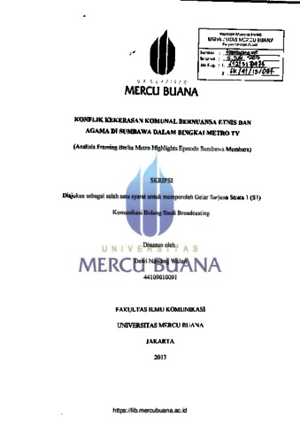 WULAN, DEWI NAWANG (2013) KONFLIK KEKERASAN KOMUNAL BERNUANSA ETNIS DAN AGAMA DI SUMBAWA DALAM BINGKAI METRO TV (Analisis Framing Berita Metro Highlights Episode Sumbawa Membara). S1 thesis, Universitas Mercu Buana.