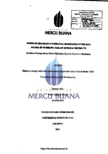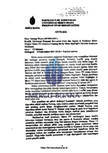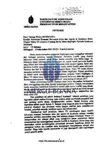 Dewi Nawang Wulan (44109010091) Konflik Kekerasan Komunal Bernuansa Etnis dan Agama di Sumbawa dalam Bingkai Metro TV (Analisis Framing Berita Metro Highlights Episode Sumbawa Membara) (xiv)+ 135 halaman Bibliografi: 35 buku (tahun 2001-2012) +4 artikel internet Media massa merupakan pengamat lingkungan yang menyajikan informasi dari berbagai peristiwa kepada khalayak Peristiwa konflik yang disertai kekerasan selalu menarik untuk diliput karena memiliki nilai berita tinggi. Di Indonesia dalam beberapa tahun belakangan ini, marak terjadi peristiwa konflik yang diikuti aksi kekerasan komunal bernuansa etnis maupun agama. Salah satu peristiwa konflik yang mendapat perhatian media adalas konflik antar kelompok Samawa dan Bali di Sumbawa, Nusa Tenggara Barat. Metro TV secara khusus mengulas peristiwa tersebut dalam program Metro Highlights. Tujuan penelitian ini adalah untuk mendeskripsikan pembingkaian progam Metro Highlights di Metro TV dalam kasus konflik kekerasan komunal bernuansa etnis dan agama di Sumbawa pada episode "Sumbawa Membara" yang tayang 26 Januari 2013. Dalam pemberitaan konflik idealnya suatu berita dipaparkan berdasarkan fakta sesungguhnya dan tidak dinodai kepentingan tertentu. Namun, kenyataanya media senantiasa melakukan konstruksi realitas pada barita konflik yang dibuat. Media melakukan proses pembentukan dan penceritaan kembali peristiwa dengan pembingkaian yang diatur sedemikian rupa, lengkap dengan subjektifitas dan tidak hebas nilai Tipe penelitian ini adalah deskriptif kualitiatif Metode penelitian yang digunakan adalah analisis framing, yaitu analisis untuk membedah perspektif atau cara pandang media dalam mengkonstruksi realitas. Model framing yang digunakan adalah model Robert N. Entman yang bergerak pada level bagaimana peristiwa dipahami dan dimaknai media dengan melihat pada pendefinisian masalah, penyebab masalah, penilaian moral, dan rekomendasi. Berdasarkan hasil penelitian, Metro TV membingkai kasus konflik kekerasan komunal bernuansa etnis dan agama di Sumbawa sebagai masalah perubahan perilaku masyarakat yang kini terbiasa dengan kekerasan. Metro TV memposisikan diri sebagai pihak yang mengkritisi peran pemerintah dalam menyebabkan dan menanggulangi masalah konflik di Sumbawa. Pesan yang coba ditanamkan adalah ketidaktegasan pemerintah termasuk kepolisian dalam hal penegakan hukum dan keadilan serta kesenjangan kesejahteraan sebagai akar masalah. Sikap kritis kepada pemerintah ini juga dipengaruhi oleh kepentingan politik pemilik media