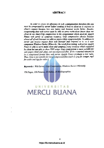 In order to create an efficiency in web communication therefore file size must be compressed by server before sending it back to client as a response to client's request because less size makes web browser works better. Besides, compressing data web server must be able to serve multi-client (more than one client in one time). Gzip compression is the compression which used for Apajeh Ponco web server to compress resource. Gzip compression chosen because almost all of web browser are able to receive Gzip compressed file. In addition to server can receive request from web browser and response to it, so it uses component Windows Socket (Winsock). The result from testing, web server Apajeh Ponco is able to serve multi-client and compress every resource which requested by client but not able to show PHP script. Gzip compression is more suitable for web pages (.html and .php), and uncompressed files. If the requested resource is in a compressed format then web server Apajeh Ponco produces a low ratio. Thus, Gzip is not suitable for lossy compressed files (such as jpeg for images, mp3 for audio and 3gp for video). Keywords: Web Server, Gzip Compression, Windows Socket (Winsock). 156 Pages, 130 Pictures, 18 Tables, 20 Bibiliographies