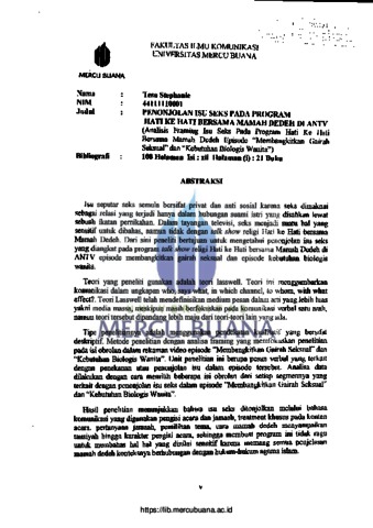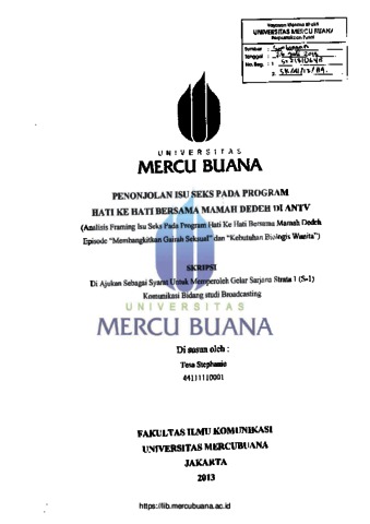 STEPHANIE, TESA (2013) PENONJOLAN ISU SEKS PADA PROGRAM HATI KE HATI BERSAMA MAMAH DEDEH DI ANTV (Analisis Framing Isu Seks Pada Program Hati Ke Hati Bersama Mamah Dedeh Episode Membangkitkan Gairah Seksual dan Kebutuhan Biologis Wanita). S1 thesis, Universitas Mercu Buana.