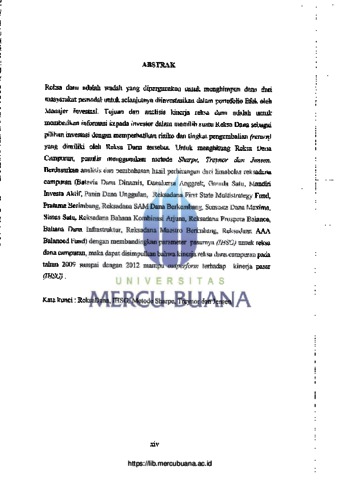 Reksa dana adalah wadah yang dipergunakan untuk menghimpun dana dari masyarakat pemodal untuk selanjutnya diinvestasikan dalam portofolio Efek oleh Manajer Investasi. Tujuan dari analisis kinerja reksa dana adalah untuk memberikan informasi kepada investor dalam memilih suatu Reksa Dana sebagai pilihan investasi dengan memperhatikan risiko dan tingkat pengembalian (return) yang dimiliki oleh Reksa Dana tersebut. Untuk menghitung Reksa Dana Campuran, penulis menggunakan metode Sharpe, Treynor dan Jensen. Berdasarkan analisis dan pembahasan hasil perhitungan dari limabelas reksadana campuran (Batavia Dana Dinamis, Danakersa Anggrek, Garuda Satu, Mandiri Investa Aktif, Panin Dana Unggulan, Reksadana First State Multistrategy Fund, Pratama Berimbang, Reksadana SAM Dana Berkembang, Semesta Dana Maxima, Simas Satu, Reksadana Bahana Kombinasi Arjuna, Reksadana Prospera Balance, Bahana Dana Infrastruktur, Reksadana Maestro Berimbang, Reksadana AAA Balanced Fund) dengan membandingkan parameter pasarnya (IHSG) untuk reksa dana campuran, maka dapat disimpulkan bahwa kinerja reksa dana campuran pada tahun 2009 sampai dengan 2012 mampu outperform terhadap kinerja pasar (IHSG). UNIVERSITAS Kata kunci: Rekstu Dana, ISO, Metode Sharpe. Treynor dan Jensen