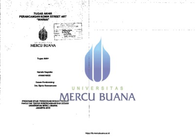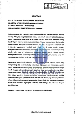 FAKULTAS TEKNIK PERENCANAAN DAN DESAIN PROGRAM STUDI PENDIDIKAN DESAIN PRODUK HARISTO NUGROHO-41906010022 PERANCANGAN KOMIK STREET ART "WARNA" Setiap gagasan dan ide dalam seni pasti memiliki cara penyampaiannya masing-masing. Ada yang penyampaiannya melalui cara tertulis maupun terlukiskan dengan indah. Baik di atas media yang tepat hingga di ruang publik yang dianggap kurang tepat. Seperti misalnya seni visual pada Street Art yang menggunakan dinding jalan sebagai media mengkomunikasikan sesuatu ide ataupun gagasan. Street art dan membantu mengangkat kembali seni visual ini di mata publik, dengan mengembangkan nila-nilai keindahan Grafitty dan penyampaian pesan moral melalui aktivis kata yang di lukiskannya, begitupun dengan komik. Komik mampu meningkatkan minat seseorang terhadap segala sesuatu yang bersifat teks dan menggagaskan ide baru untuk juga mengangkat isu sosial. Merancang komik lokal indonesia berjudul "warna dibuat dengan cerita yang mengandung nilai sosial terhadap kebersihan lingkungan dan menuangkannya ke dalam ilustrasi berunsurkan budaya asli indonesia. Dengar mengoptimalkan fungsi. komik dengan sajian cerita menarik, keunikan aliran seni grafitty dan keindahan unsur warna dalam street art, diharapkan memberi ruang bagi para pembaca dan -MEREG-BUANA-para pelaku street art khususnya, berbagi pengalaman dan kesenangan melalui dunia bacaan ringan. Agar pesan moral dan nilai seni visual yang terdapat pada seni jalanan (Street Art) pun dapat tersampaikan dengan baik dan berharap masyarakat dapat lebih mencintai lingkungan sekitarnya serta bangga ber-indonesia dengan komik lokalnya. Keyword: Komik, Street Art, Grafitty, Warna, Ilustrasi, Lingkungan