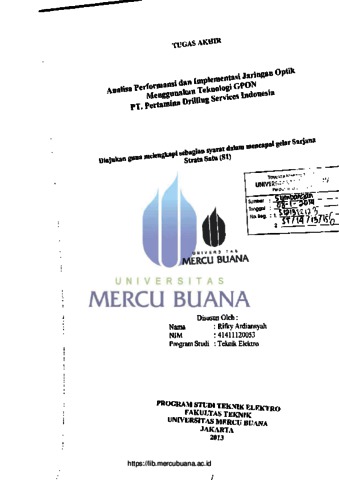 Saat ini perkembangan teknologi telekomunikasi bergerak mengalami kemajuan yang sangat pesat. Perkembangan teknologi telekomunikasi ini sangat berpengaruh dalam segala aspek kehidupan. Dengan meningkatnya kebutuhan sistem komunikasi dan layanan komunikasi (suara, data dan video) di PT. Pertamina Drilling Services Indonesia, maka dibutuhkan penyediaan infrastruktur telekomunikasi yang handal guna meningkatkan performansi operasional. Keterbatasan jaringan akses tembaga dengan menggunakan kabel UTP yang dinilai belum cukup dimana hanya memiliki kecepatan transmisi data sampai 100 Mbps dan belum dapat menampung kapasitas bandwidth yang besar pada saat digunakan secara bersamaan, maka jaringan akses fiber optik merupakan solusinya dimana memiliki kecepatan transmisi data hingga 2,5 Gbps, VILN Dalam Tugas Akhir ini, akan menjelaskan mengenai implementasi jaringan optik menggunakan teknologi GPON di PT. Pertamina Drilling Services Indonesia kemudian dilakukan analisa performansi jaringan dengan menggunakan parameter antara lain throughput, utilization, delay dan packet loss agar mendukung kebutuhan operasional.