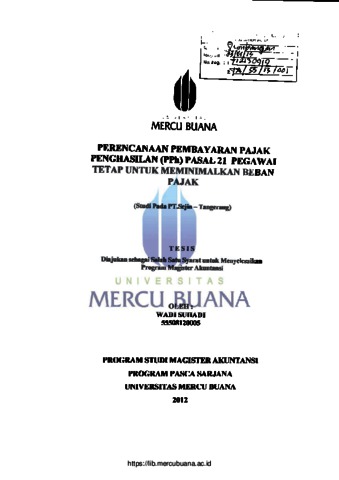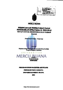 SUHADI, WIDI (2012) PERENCANAAN PEMBAYARAN PAJAK PENGHASILAN (PPH) PASAL 21 PEGAWAI TETAP UNTUK MEMINIMALKAN BEBAN PAJAK. S2 thesis, Universitas Mercu Buana Jakarta.