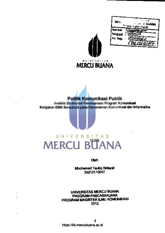 Hidayat, Mochamad Taufiq (2013) Politik komunikasi publik (Analisis struktur perencanaan program kebijakan BBM bersubsidi pada kementrian komunikasi dan informatika). S2 thesis, Universitas Mercu Buana Jakarta.