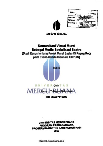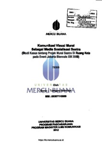 Sukmana, Tubagus (2012) Komunikasi Visual Mural sebagai Media Sosialisasi Sastra (Studi Kasus tentang Proyek Mural Sastra di Ruang Kota pada Event Jakarta Biennale XIII 2009). S2 thesis, Universitas Mercu Buana Jakarta.