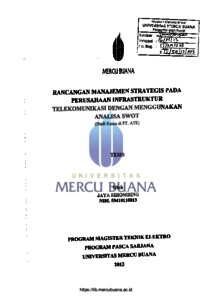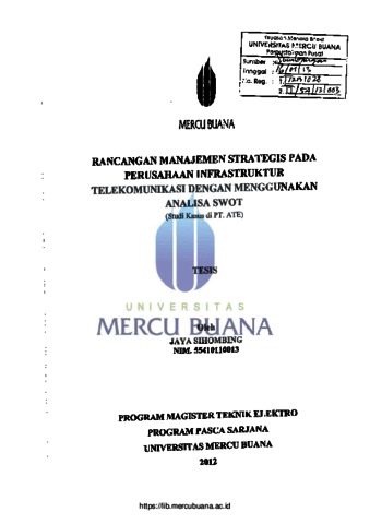 SIHOMBING, JAYA (2012) RANCANGAN MANAJEMEN STRATEGI PADA PERUSAHAAN INFRASTRUKTUR TELEKOMUNIKASI DENGAN MENGGUNAKAN ANALISIS SWOT (Studi Kasus di PT. ATE). S2 thesis, Universitas Mercu Buana Jakarta.