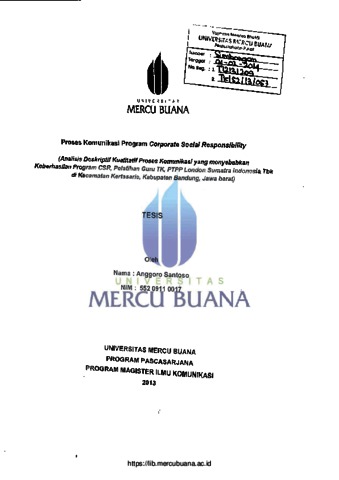Santoso, Anggoro (2013) Proses Komunikasi Program Corporate Social Responsibility(Analisis Deskritif Kualitatif Aktivitas Komunikasi yang menyebabkan keberhasilan program CSR, pelatihan guru TK, PT PP london sumatra indonesia Tbk di kecamatan kertasarie, kabupaten Bandung, Jawa. S2 thesis, Universitas Mercu Buana.