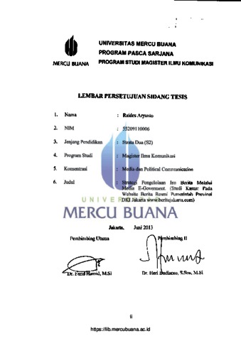 STRATEGI PENGELOLAAN ISU BERITA MELALUI MEDIA E-GOVERMENT (Studi Kasus: Pada Website Berita Resmi Pemerintah Provinsi DKI Jakarta "www.beritajakarta.com") Terbitnya Undang-Undang Nomor 14 Tahun 2008 tentang Keterbukaan Informasi Publik menuntut Pemerintah Provinsi DKI Jakarta mengembangkan media e-government untuk meningkatkan kualitas layanan publik secara efektif dan efisien. Dalam rangka membentuk opini positif pemerintah, keberadaan website beritajakarta.com juga diharapkan berfungsi sebagai media referensi, klarifikasi dan penyeimbang terhadap opini yang disampaikan di media massa terhadap kinerja pelayanan publik yang dilakukan Pemerintah Provinsi DKI Jakarta. Maka dari itu, penelitian ini bertujuan untuk: 1) mendeskripsikan strategi pengelolaan isu berita melalui media e-goverment website beritajakarta.com; 2) mengetahui sejauh mana fungsinya dalam mendukung kinerja dan citra Pemerintah Provinsi DKI Jakarta. Untuk mencapai tujuan itu, diperlukan strategi pengelolaan isu berita pada media e-Goverment beritajakarta.com. Penelitian ini mengambil sejumlah teori antara lain Internet (Media Online) sebagai Medium Komunikasi, News Portal sebagai New Media, dan teori tentang Pemberitaan (news) di Media Massa, serta teori e-Government. Selanjutnya teori juga digunakan ialah Strategi Komunikasi dan Manajemen Media. Penelitian ini didesain menggunakan metode studi kasus dengan pendekatan kualitatif. Paradigma penelitian yang digunakan adalah Paradigma Konstruktivisme. Hasil penelitian menunjukkan strategi pengelolaan isu yang perlu dioptimalkan oleh website beritajakarta.com adalah meningkatkan kualitas dan kuantitas berita, fokus berita pada lima isu yakni Transportasi, Penanganan Banjir, Kesbangpol, Pemerintahan Umum dan Kependudukan. Strategi lainnya adalah isu-isu perencanaan yang merupakan hasil agenda rapat pimpinan perlu ditindaklanjuti dengan maksimal melalui rapat redaksi yang kemudian menjadi arahan atau referensi bagi wartawan/reporter di lapangan. Monitoring melalui pengamatan langsung di media cetak/online maupun lewat aplikasi jejak berita selanjutnya disusun menjadi bagian dari evaluasi. Hasil inilah yang kemudian dirapatkan oleh redaksi dan diajukan menjadi salah satu agenda rapat pimpinan.