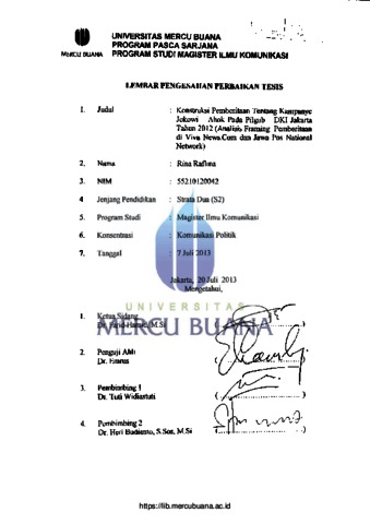 Raflina, Rina (2013) Kontruksi Pemberitaan Tentang Kampanye Jokowi-Ahok Pada Pilgub DKI Jakarta Tahun 2012 (Analisis Framing Pemberitaan di Via News.com dan Jawa Pos National Network). S2 thesis, Universitas Mercu Buana.