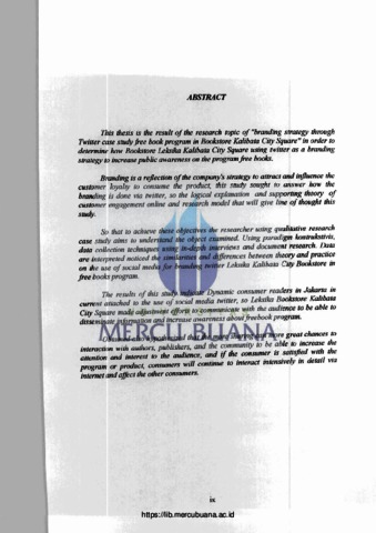 Tesis ini merupakan hasil dari penelitian bertopik "strategi branding melalui Twitter studi kasus program buku gratis di Toko Buku Kalibata City Square" dengan tujuan untuk mengetahui bagaimana Toko Buku Leksika Kalibata City Square menggunakan twitter sebagai strategi branding dalam meningkatkan awareness khalayak pada program buku gratis?. Branding adalah cerminan strategi perusahaan untuk menarik pengaruh dan kesetiaan pelanggan untuk mengkonsumsi suatu produk, penelitian ini berupaya menjawab bagaimana strategi branding dilakukan melalui twitter, maka penjelasan logis serta pendukung teori utama dan teori pendukung customer engagement online dan model penelitian yang memberikan alur pikir dalam penelitian ini Untuk mencapai tujuan tersebut penelitian menggunakan metode kualitatif studi kasus bertujuan untuk memahami obyek yang ditelitinya. Menggunakan paradigma kontrukstivis teknik pengumpulan data dengan menggunakan wawancara mendalan dan studi dokumen. Data diinterpretasikan memperhatikan persamaan dan perbedaan antara teori dan praktik tentang pemanfaatan media sosial twitter untuk strategi branding Toko Buku Leksika Kalibata City dalam program buku gratis. Hasil dari penelitian ini menunjukan Dinamika konsumen pembaca buku di Jakarta saat ini lekat dengan penggunaan sosial media twitter, sehingga Toko Buku Leksika Kalibata City Square melakukan upaya penyesuaian ber-komunikasi dengan agar mampu menyebarluaskan informasi program freebook dan meningkatkan awareness MERCU BUANA Didapat pula hipotesis bahwa semakin banyak sharing maka semakin besar peluang terjadinya interaction dengan penulis, penerbit, dan komunitas untuk dapat meningkatkan attention serta interest kepada khalayak, dan jika konsumen puas terhadap program atau produk maka konsumen akan terus berinteraksi intensif secara detail melalui internet dan mempengaruhi konsumen lainnya.