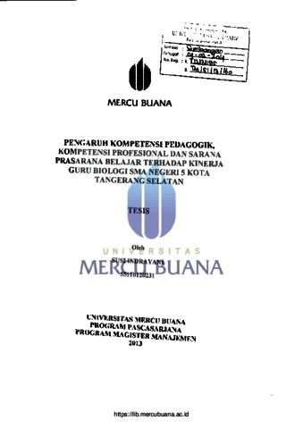 INDRIYANI, SUSI (2013) Pengaruh Kompetensi Pedagogik, Kompetensi profesional dan sarana Prasarana Belajar terhadap Kinerja Guru Biologi SMA Negri 5 Kota Tangerang Selatan. S2 thesis, Universitas Mercu Buana.