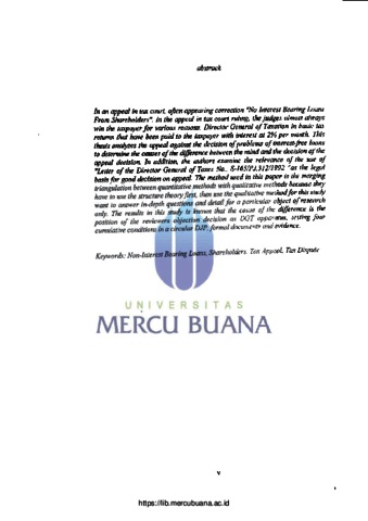 Dalam banding di pengadilan pajak, sering muncul koreksi "Pinjaman Tanpa Bunga Dari Pemegang Saham". Dalam putusan banding di pengadilan pajak, majelis hakim hampir selalu memenangkan wajib pajak dengan berbagai alasan. Direktur Jenderal Pajak dalam mengembalikan pokok pajak yang telah disetor kepada wajib pajak disertai bunga sebesar 2% perbulan. Tesis ini menganalisis keputusan banding terhadap permasalahan pinjaman tanpa bunga untuk mengetahui sebab-sebab timbulnya perbedaan antara keputusan keberatan dan putusan banding. Selain itu, penulis menelaah relevansi penggunaan "Surat Direktur Jenderal Pajak No. S-165/PJ.312/1992" sebagai dasar hukum pengambilan keputusan baik di tingkat banding. Metode penulisan yang digunakan dalam penulisan ini adalah triangulasi yaitu penggabungan antara metode kuantitatif dengan metode kualitatif karena harus menggunakan struktur teori terlebih dahulu, kemudian menggunakan metode kualitatif karena penelitian ini ingin menjawab pertanyaan yang mendalam dan detail khususnya untuk satu objek penelitian saja. Hasil dalam penelitian ini diketahui bahwa penyebab timbulnya perbedaan keputusan adalah posisi penelaah keberatan sebagai aparatur DJP, pengujian empat syarat kumulatif dalam surat edaran DJP, kelengkapan dokumen dan bukti formal. Kata kunci: Pinjaman Tanpa Bunga, Pemegang Saham, Banding, Sengketa