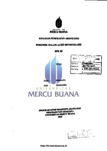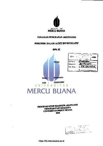 THE OBSERVATION OF FORENSIC ACCOUNTING APPLICATION ON INVESTIGATIVE AUDIT BY THE AUDIT BOARD OF REPUBLIC OF INDONESIA BY: BRAMANDITTO 55508110006 ABSTRACT In Indonesia, to fight against corruption needs a lot of effort. One of them is to increase the ability of auditor who conduct investigative audit. Solving complex corruption cases can't be done by layering control without enhancing audit technique especially in detecting person who conduct corruption. The purpose of this research is to be able to know apply forensic accounting in investigative audit in The Audit Board of Republic of Indonesia. Variables in this research are forensic accounting theory and investigative audit of The Audit Board of Republic of Indonesia. In addition, this research discover the correlation of forensic accounting in investigative audit and law emphasizing especially in corruption. The result of this research will show that guidance technique of investigatif audit of The Audit Board of Republic of Indonesia need improvement which based on both forensic accounting theory and manual Association of Certified Fraud Examiner (ACFE) to prevent white color crime which grow Imelonesia being left behind according to complexity financial transaction business later without the law in BUANA Key words: forensic accounting, investigative audit, guidance technique of investigative audit.