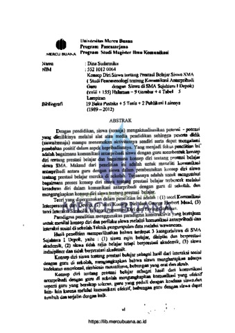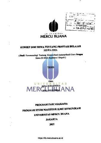 Sudarmika, Dina (2013) Konsep Diri Siswa Tentang Prestasi Belajar Siswa SMA (studi fenomenaologi komunikasi antarpribadi guru dengan siswa di SMA Sejahtera I depok). S2 thesis, Universitas Mercu Buana.