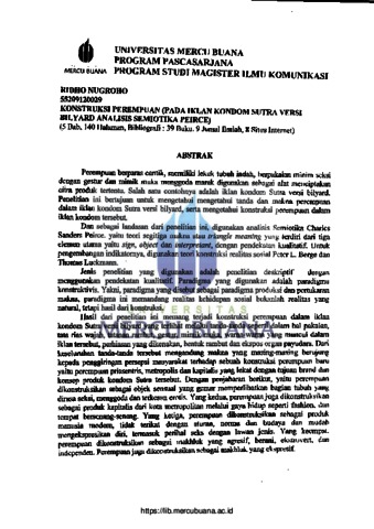 Perempuan berparas cantik, memiliki lekuk tubuh indah, berpakaian minim seksi dengan gestur dan mimik muka menggoda marak digunakan sebagai alat menciptakan citra produk tertentu. Salah satu contohnya adalah iklan kondom Sutra versi bilyard. Penelitian ini bertujuan untuk mengetahui mengetahui tanda dan makna perempuan dalam iklan kondom Sutra versi bilyard, serta mengetahui konstruksi perempuan dalam iklan kondom tersebut. Dan sebagai landasan dari penelitian ini, digunakan analisis Semiotika Charles Sanders Peirce. yaitu teori segitiga makna atau triangle meaning yang terdiri dari tiga elemen utama yaitu sign, object dan interpretant, dengan pendekatan kualitatif. Untuk pengembangan indikatornya, digunakan teori konstruksi realitas sosial Peter L. Berge dan Thomas Luckmann. Jenis penelitian yang digunakan adalah penelitian deskriptif dengan menggunakan pendekatan kualitatif. Paradigma yang digunakan adalah paradigma konstruktivis. Yakni, paradigma yang disebut sebagai paradigma produksi dan pertukaran makna, paradigma ini memandang realitas kehidupan sosial bukanlah realitas yang Hasil dari penelitian ini memang terjadi konstruksi perempuan dalam iklan natural, tetapi hasil dari konstruksi. ERSITAS kondom Sutra versi bilyard yang terlihat melalui tanda-tanda seperti dalam hal pakaian, tata rias wajah, tatanan rambut, gestur, mimik muka, warna-warna yang muncul dalam iklan tersebut, perhiasan yang dikenakan, bentuk rambut dan ekspos organ payudara. Dari keseluruhan tanda-tanda tersebut mengandung makna yang masing-masing berujung kepada penggiringan persepsi masyarakat terhadap sebuah konstruksi perempuan baru yaitu perempuan priasentris, metropolis dan kapitalis yang lekat dengan tujuan brand dan konsep produk kondom Sutra tersebut. Dengan penjabaran berikut, yaitu perempuan dikonstruksikan sebagai objek sensual yang gemar memperlihatkan bagian tubuh yang dirasa seksi, menggoda dan terkesan erotis. Yang kedua, perempuan juga dikonstruksikan sebagai produk kapitalis dari kota metropolitan melalui gaya hidup seperti fashion, dan tempat bersenang-senang. Yang ketiga, perempuan dikonstruksikan sebagai produk manusia modern, tidak terikat dengan aturan, norma dan budaya dan mudah mengekspresikan diri, termasuk perihal seks dengan lawan jenis. Yang keempat, perempuan dikonstruksikan sebagai makhluk yang agresif, berani, ekstrovert, dan independen. Perempuan juga dikonstruksikan sebagai makhluk yang ekspresif.
