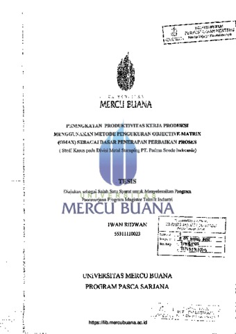 Ridwan, Iwan (2013) Peningkatan Produktivitas Kerja Produksi Menggunakan Metode Pengukuran Objective Matrix (OMAX) Sebagai dasar Penerapan Perbaikan Proses (studi kasus pada Divisi Metal Stamping PT. Padma Soode Indonesia). S2 thesis, Universitas Mercu Buana.