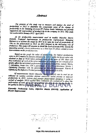 The purpose of this study was to measure and analyze the level of productivity in 2012 to determine the components cause of the change of productivity in the Stamping Division PT Padma Soode Indonesia and provide suggestions for improvement of productivity in the company in 2013. This study was conducted in January 2012 April 2013. As for productivity measurement used is models Objective Matrix (OMAX). Proposed improvements in productivity improvements Stamping Division is to achieve the target by 2013 is to raise the level of productivity of 15% on the achievement in 2012. In 2013 forecast to the increasing cost of production. This study will examine in detail the level of productivity, namely by measuring several criteria performance as a data base for phase commit process improvements on the production line. Based on the graph the value of productivity, the highest productivity value in 2012 reached in January amounted to 525.52, while the lowest value was obtained in June at 98.03 below periaode basis of the value of 300. There are three indicators of work of the seven indicators of employment are considered to greatly affect the calculated performance of reduced productivity, namely: kiteria 5 Optimizing Down time with a percentage of 31.10% achievement, kiteria 7 Optimizing Overtime with the percentage of 20.14% achievement. Kiteria 6 Optimizing the Defective Product percentage achievement of 16.95%. Of measurements Model Objective Matrix (OMAX, can be used as an indicator in running activities planner corrective action process to improve productivity in 2013. Actions and process improvement planning is using a method of analysis 5W1H against three indicators are considered to affect the be applied in 2013 to increase productivity. to increase productivity. performance of work, there there are ten proposed adoption process improvements to U BUANA Keywords: Productivity Index, Objective Matrix (OMAX), Application of Process Improvement