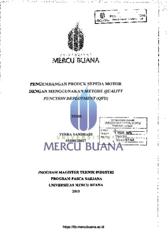 Sandradi, Yusra (2013) Pengembangan Produk Sepeda Motor Dengan Menggunakan Metode Quality Function Deployment (QFD). S2 thesis, Universitas Mercu Buana.