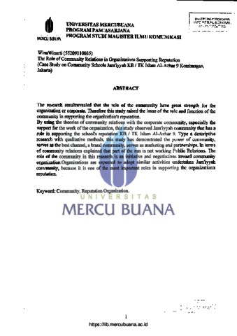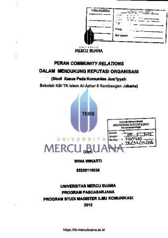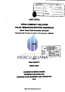 Winarti, Wina (2013) Peran Community Relations Dalam Mendukung Reputasi Organisasi (Studi Kasus Pada Komunitas Jamiyyah Sekolah KB/TK Islam Al-Azhar 9 Kembangan Jakarta). S2 thesis, Universitas Mercu Buana.