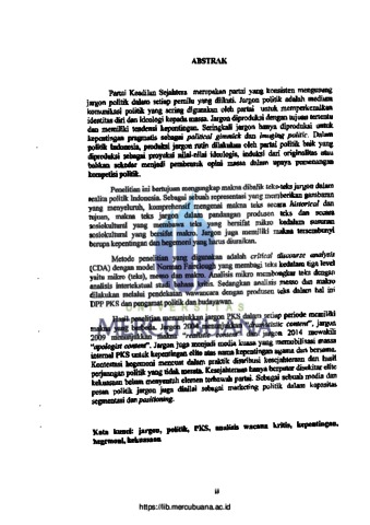 Partai Keadilan Sejahtera merupakan partai yang konsisten mengusung jargon politik dalam setiap pemilu yang diikuti. Jargon politik adalah medium komunikasi politik yang sering digunakan oleh partai untuk memperkenalkan identitas diri dan ideologi kepada massa. Jargon diproduksi dengan tujuan tertentu dan memiliki tendensi kepentingan. Seringkali jargon hanya diproduksi untuk kepentingan pragmatis sebagai political gimmick dan imaging politic. Dalam politik Indonesia, produksi jargon rutin dilakukan oleh partai politik baik yang diproduksi sebagai proyeksi nilai-nilai ideologis, induksi dari originalitas atau bahkan sekedar menjadi pembentuk opini massa dalam upaya pemenangan kompetisi politik. Penelitian ini bertujuan mengungkap makna dibalik teks-teks jargon dalam realita politik Indonesia. Sebagai sebuah representasi yang memberikan gambaran yang menyeluruh, komprehensif mengenai makna teks secara historical dan tujuan, makna teks jargon dalam pandangan produsen teks dan secara sosiokultural yang membawa teks yang bersifat mikro kedalam susunan sosiokultural yang bersifat makro. Jargon juga memiliki makna tersembunyi berupa kepentingan dan hegemoni yang harus diuraikan. Metode penelitian yang digunakan adalah critical discourse analysis (CDA) dengan model Norman Fairclough yang membagi teks kedalam tiga level yaitu mikro (teks), messo dan makro. Analisis mikro membongkar teks dengan analisis intertekstual studi bahasa kritis. Sedangkan analisis messo dan makro dilakukan melalui pendekatan wawancara dengan produsen teks dalam hal ini DPP PKS dan pengamat politik dan budayawan. S Hasil penelitian menunjukkan jargon PKS dalam setiap periode memiliki makna yang berbeda. Jargon 2004 menunjukkan "dramatistic content", jargon 2009 menunjukkan makna "realistic content dan jargon 2014 mewakili "apologist content". Jargon juga menjadi media kuasa yang memobilisasi massa internal PKS untuk kepentingan elite atas nama kepentingan agama dan bersama. Kontestasi hegemoni mencuat dalam praktik distribusi kesejahteraan dan hasil perjuangan politik yang tidak merata. Kesejahteraan hanya berputar disekitar elite kekuasaan belum menyentuh elemen terbawah partai. Sebagai sebuah media dan pesan politik jargon juga dinilai sebagai marketing politik dalam kapasitas segmentasi dan positioning. Kata kunci: jargon, politik, PKS, analisis wacana kritis, kepentingan, hegemoni, kekuasaan