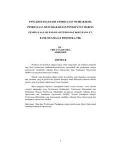 Penelitian ini dilakukan dengan tujuan untuk mengetahui ada tidaknya pengaruh bagi hasil pembiayaan mudharabah,pembiayaan musyarakah dan pendapatan margin pembiayaan murabahah terhadap Biaya Operasional dann Pendapatan Operasional (BOPO) secara parsial dansecara simultan. Metode yang digunakan adalah metode kausal.Data yang digunakan merupakan data sekunder yang di peroleh dari laporan keuangan Bank Muamalat Indonesia.Model analisis yang di gunakan adalah regresi linier berganda. Hasil pengujian hipotesis menunjukan bahwa secara bersama -sama seluruh variabel independen yaitu Pembiayaan Mudharabah, Pembiayaan Musyarakah dan Pendapatan Margin Pembiayaan Murabahah mempunyai pengaruh terhadap Biaya Operasional dan Pendapatan Operasional (BOPO). Namun Pendapatan Margin Pembiayaan Murabahah yang berpengaruh signifikan terhadap Biaya Operasional dan Pendapatan Operasional (BOPO).