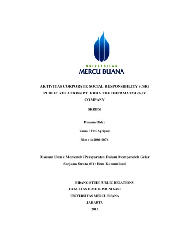 Apriyani, Vivi (2013) AKTIVITAS CORPORATE SOCIAL RESPONSIBILITY (CSR) PUBLIC RELATIONS PT. ERHA THE DHERMATOLOGY COMPANY. S1 thesis, Universitas Mercu Buana.
